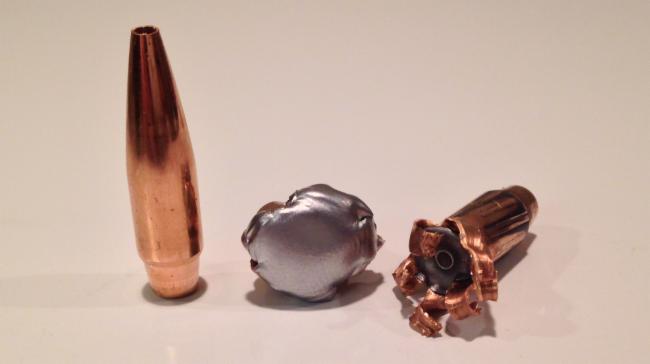 The middle bullet was shot into 10 % ballistic gell at 2100 fps, and the far right bullet was shot in to gell at 1250 fps.