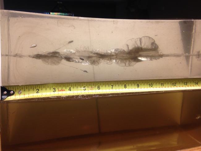 220 Exot at 950fps. Total penetration 16". Lead petal fragments 5 to 6 inches.